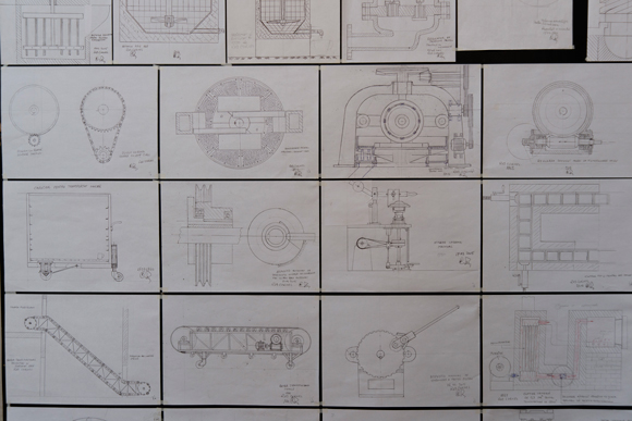Cornel Rus, technical drawings of industrial machinery made from memory, 2014-2015, installation view from Unde ați lucrat? / Ki hol dolgozott? / Where Have You Worked?, Tranzit House, 15-27 October 2015, Photo by Răzvan Anton