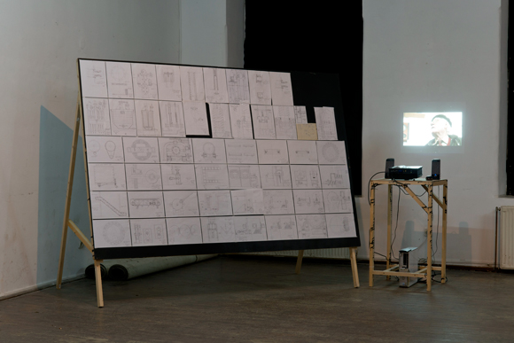 Cornel Rus, technical drawings of industrial machinery made from memory, 2014-2015 (on the left), video interview, 2015 (on the right), installation view from Unde ați lucrat? / Ki hol dolgozott? / Where Have You Worked?, Tranzit House, 15-27 October 2015, Photo by Miklós Szilárd