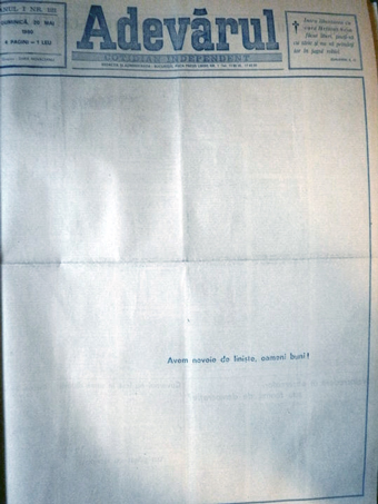 Claudiu Cobilanschi, "Avem nevoie de liniște oameni buni!" Adevărul, 20 mai 1990, *Frontpage // kunsthalle.ro*, 2016