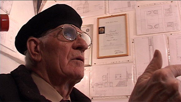 Cornel Rus, technical drawings of industrial machinery made from memory, 2014-2015 (on the left), video interview, 2015 (on the right), installation view from Unde ați lucrat? / Ki hol dolgozott? / Where Have You Worked?, Tranzit House, 15-27 October 2015, Photo by Miklós Szilárd